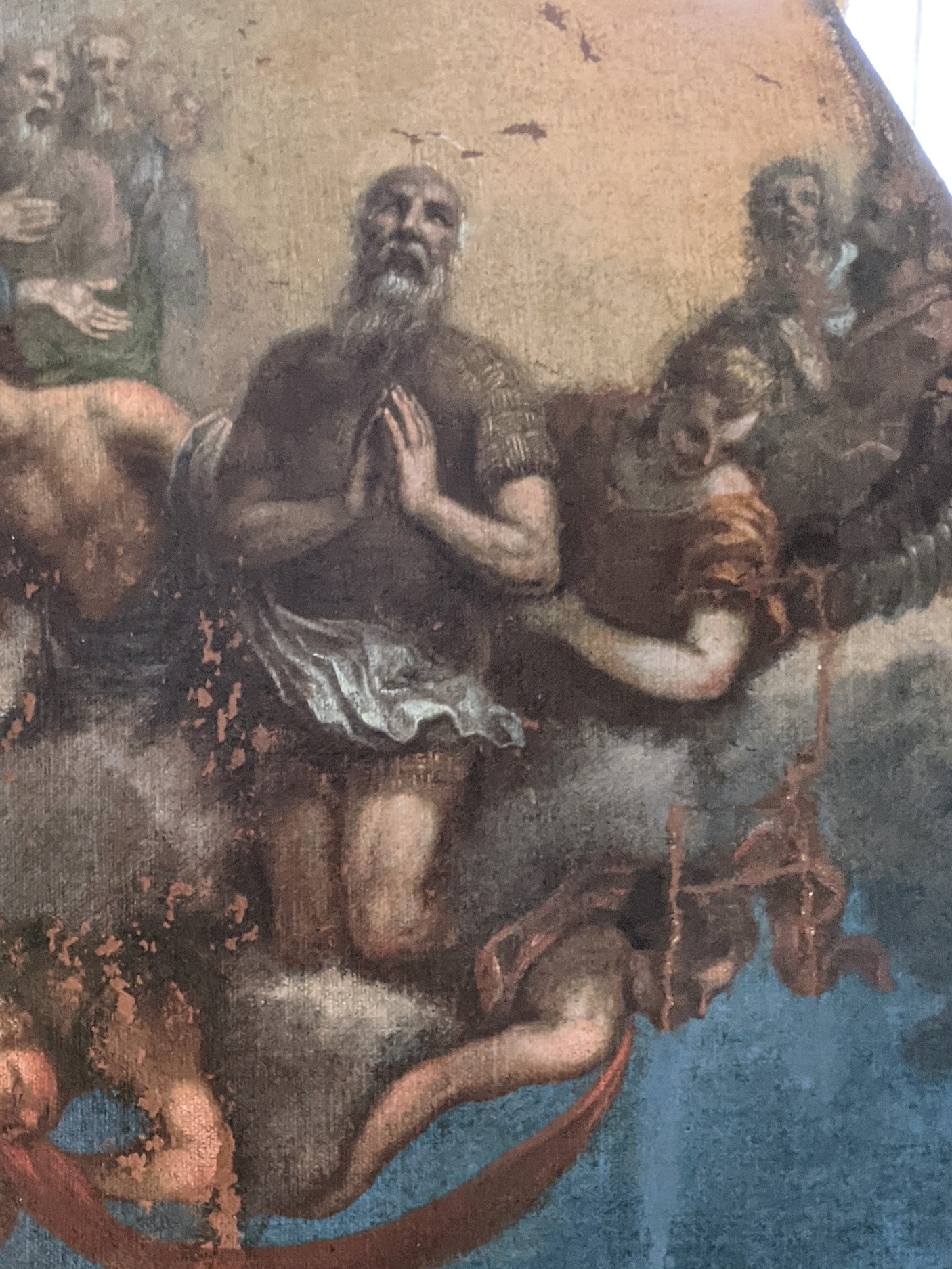 Tableau perdu depuis un demi siècle, et retrouvé sans châssis, au sol, dans un grenier de la sacristie.